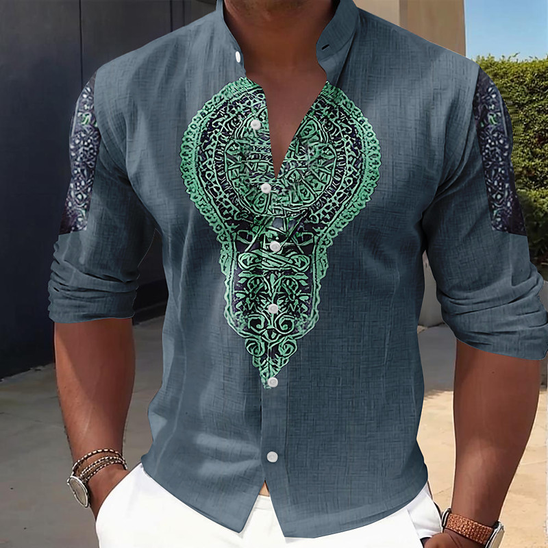 Men's Geometric Pattern Ethnic Shirt Button Up Shirt Stand Collar Shirt Long Sleeve Vintage Retro Daily Outdoor Vacation Spring Fall Mandarin Collar Band Collar 3D Print Linen Like Shirt Blue Dark