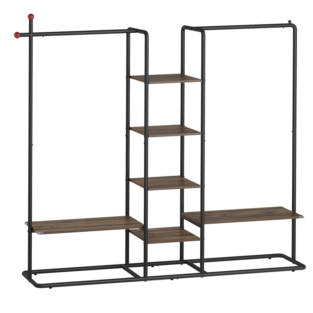 Stand appendiabiti aperto con 6 ripiani e 2 barre noce naturale e nero