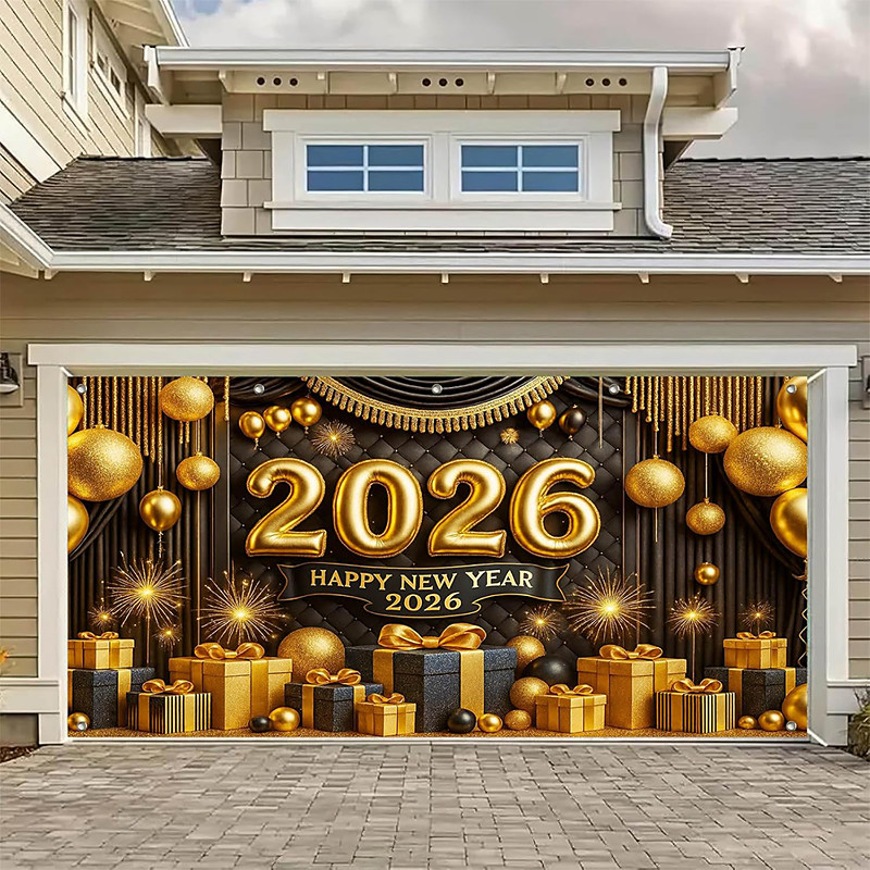 New Year Tapestry Garage Door Cover Large Hanging Backdrop 2026 Fireworks Cute 3D Party Outdoor Holiday Shooting Backgrounds Yard Home Decor