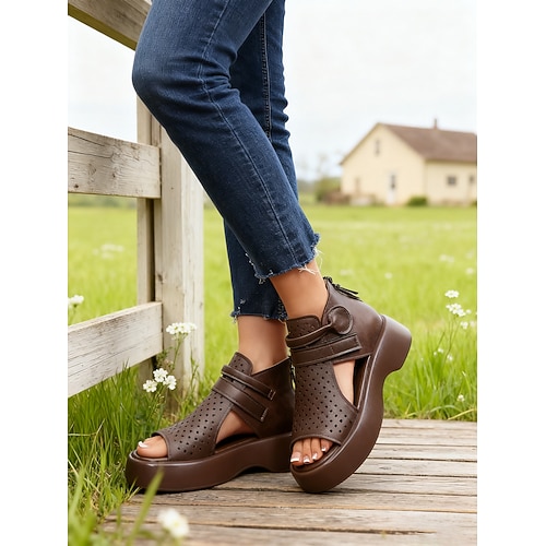 sandali da donna con zeppa e plateau traforati marroni - cinturino alla caviglia con fibbia spessa, comode calzature casual aperte per passeggiate quotidiane, vacanze ed estate all'aperto