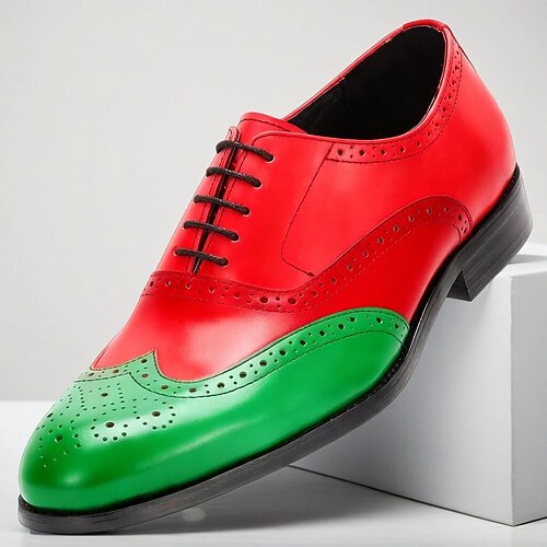 scarpe brogue da uomo in vernice rossa e verde: calzature formali eleganti e audaci per Natale, feste e occasioni speciali