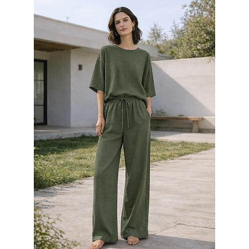 15% lino set da donna in lino misto lino set due pezzi basic colore puro tasca elastico in vita maglietta pantaloni strada quotidiano manica lunga girocollo nero bianco blu navy marrone chiaro blu estate primavera