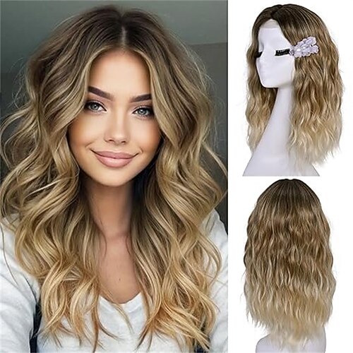 Kurze, gewellte Perücken für Frauen, schwarze Bob-Wellenperücke, natürlich aussehendes synthetisches Mittelteil, Spitzenfronthaar für die alltägliche Frisur, 18 Zoll