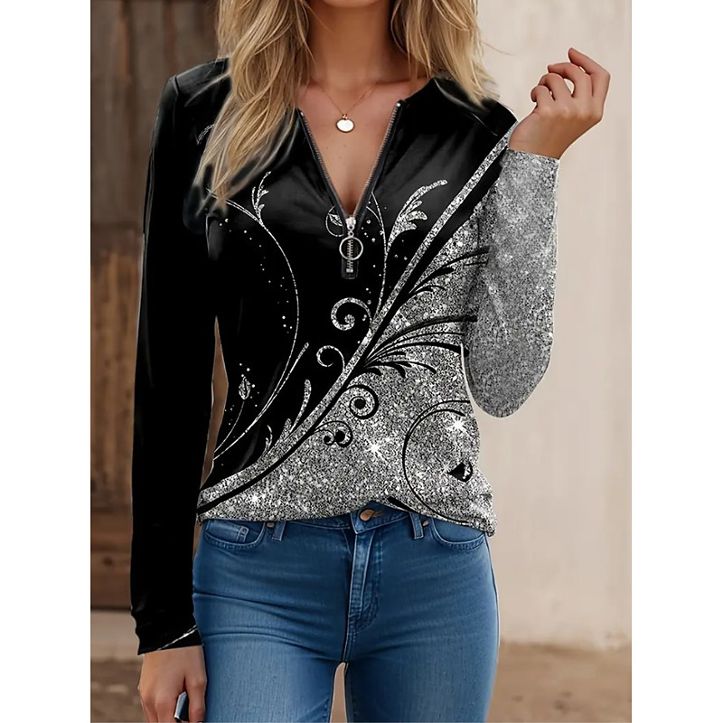 Women's T Shirt Quarter Zip Long Sleeve Casual Graphic Tribal Vintage Bohemia Tropical Hawaiian V Neck Regular Tops Daily Going out Black Spring Fall