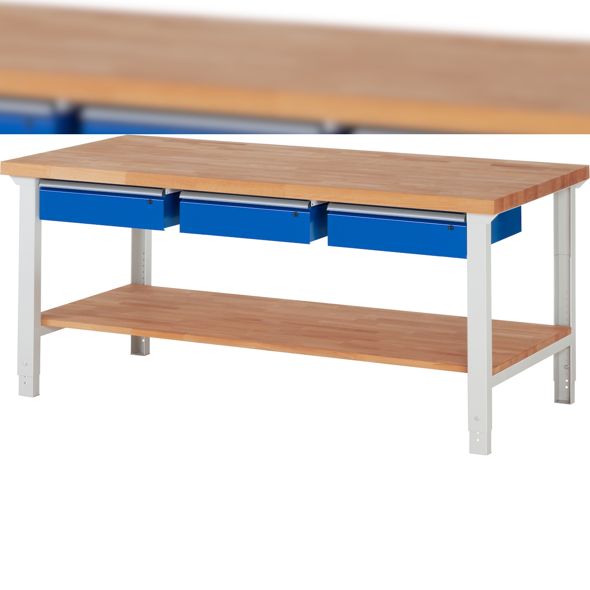PROREGAL Werkbank Serie 7000 - Modell 7003 | HxBxT 79-114x200x90cm | 3x Schublade + Ablageboden | Schubladenmaße 3x150mm