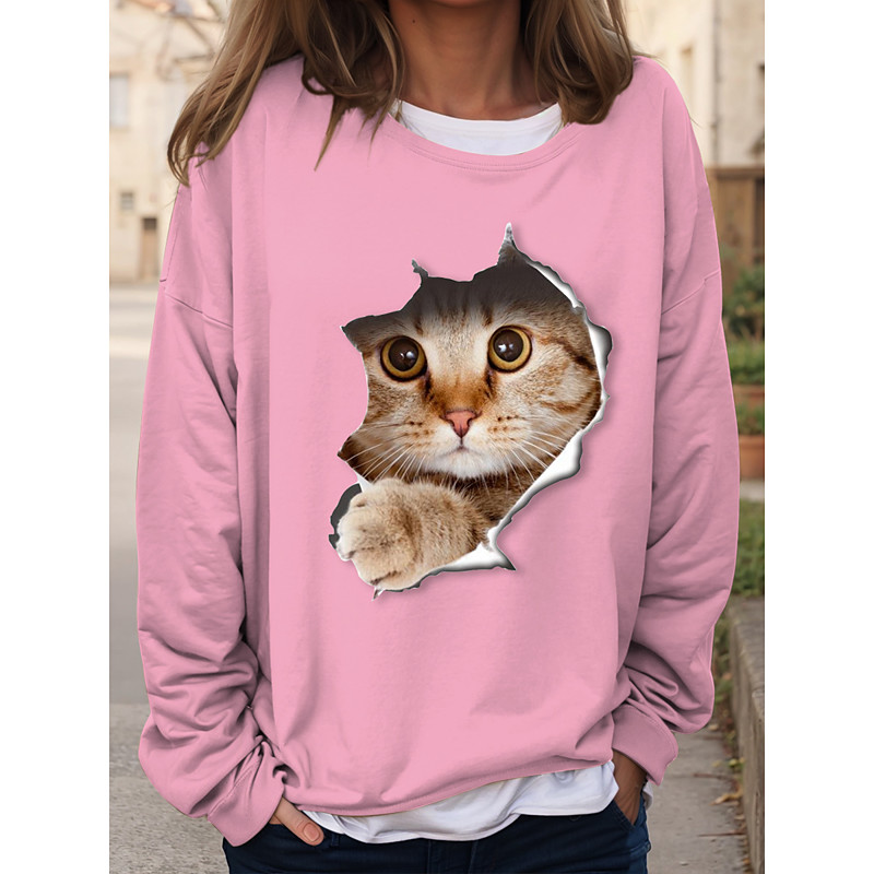 Women's Sweatshirts Graphic Cat Casual Long Sleeve Crew Neck Regular Tops Casual Print Black Pink Red Blue Khaki Fall Winter