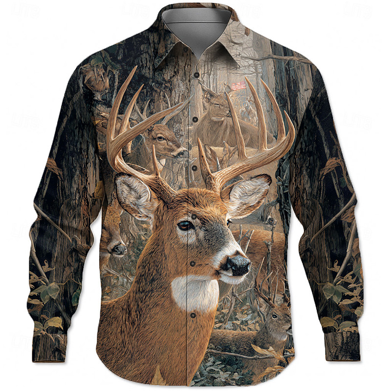 Men's Reindeer Wildlife Camo / Camouflage Shirt Button Up Shirt Long Sleeve Ethnic Vintage Retro Outdoor Camping Hiking Hunting Spring Fall Turndown 3D Print Linen Like Shirt Black