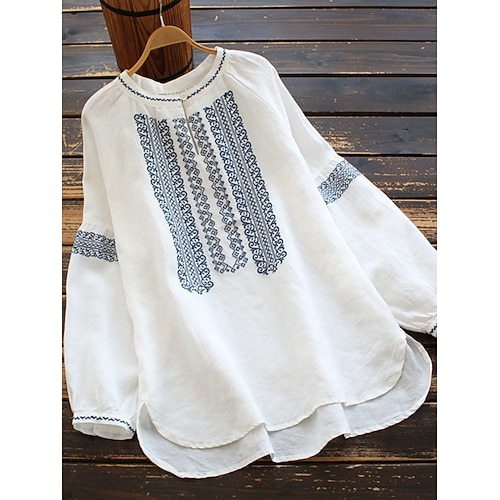 Per donna Camicie di cotone e lino Floreale Essenziale Casual Manica Lunga Girocollo Top Regolari Quotidiano Ricamato Bianco Blu marino Estate Primavera Autunno