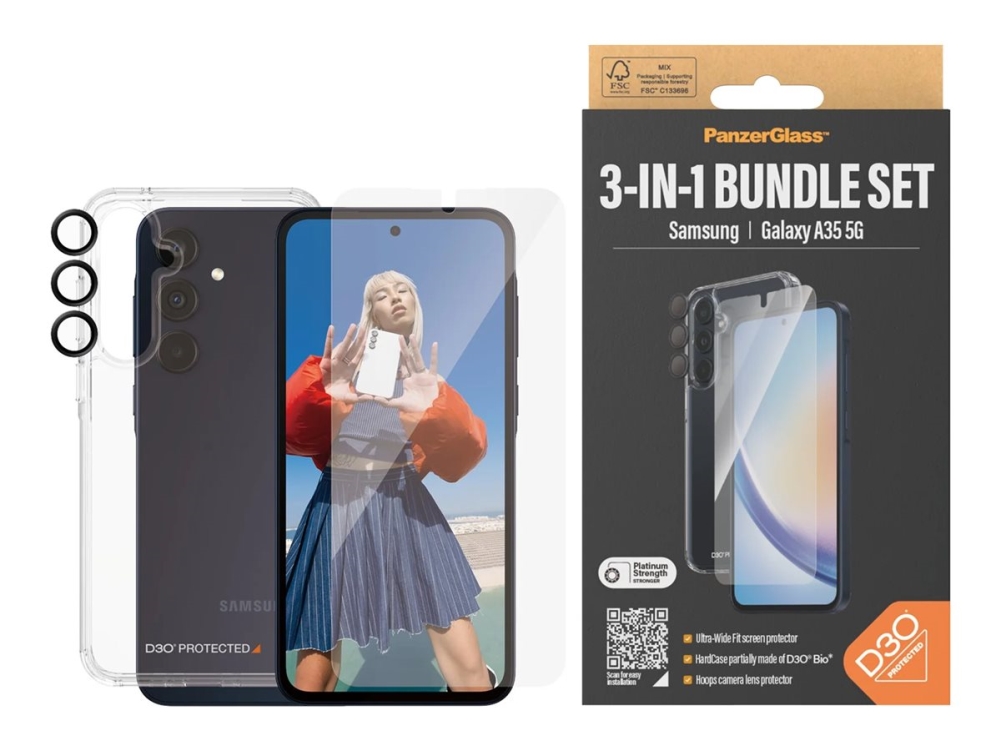 PanzerGlass - 3-i-1 beskyttelsespakke - baksidedeksel for mobiltelefon - ultrabred passform med EasyAligner - D3O Bio, 100 % resirkulert plast - med skjerm- og linsebeskytter - for Samsung Galaxy A35
