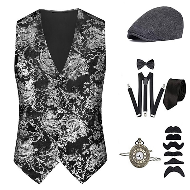 1920s Vintage Inspired The Great Gatsby Party Costume Masquerade Accessories Set Sleeveless Printing Turndown Fancy Dress Men's Halloween Party Evening Casual Daily Adults' Vest Hat All Seasons