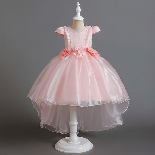 Blumenmädchenkleid Mädchen Formelle Kleidung Hochzeitskleidung Party Hochzeit Formell Niedlich Formell Prinzessin Kleid für die Erstkommunion Patchwork Netz Einfarbig Kurzarm V-Ausschnitt Weiß Rosa