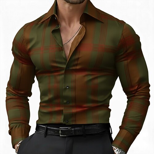 Herren Geometrisch Karo / Karomuster Hemd Satinhemd Kleidhemd Langarm Business-Casual Urlaub Alltagskleidung Sommer Frühling Herbst Umlegekragen 3D-Druck Hemden mit Knopfleiste Schwarz Armeegrün