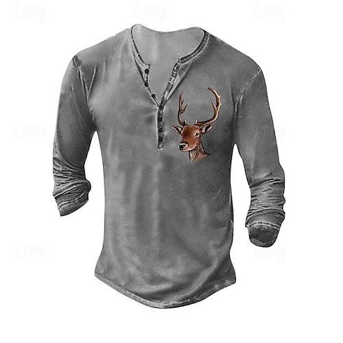 Herren Henley Hemd T-Shirt Langarmshirt Langarm Henley Sommer Herbst Muster Hirsch Mode Designer Mode Jahrgang Urlaub Straße Ausgehen Dunkelgrau Schwarz Weiß Top T-Shirt für Herren