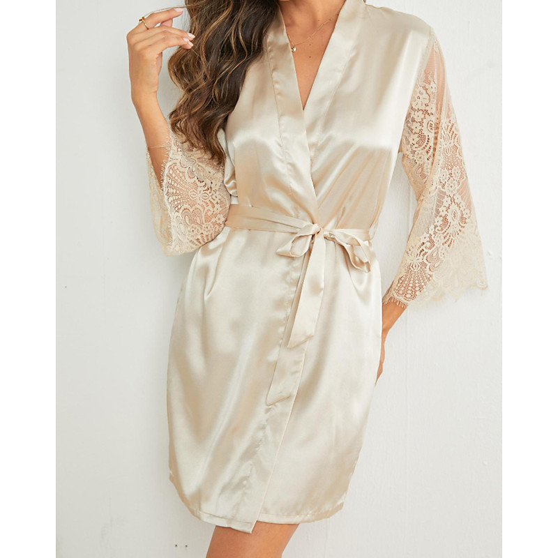 Women's Robe Casual Soft Satin Pure Color Lace Daily Home Bed Long Sleeve V Neck Black White Champagne Summer Regular Fit
