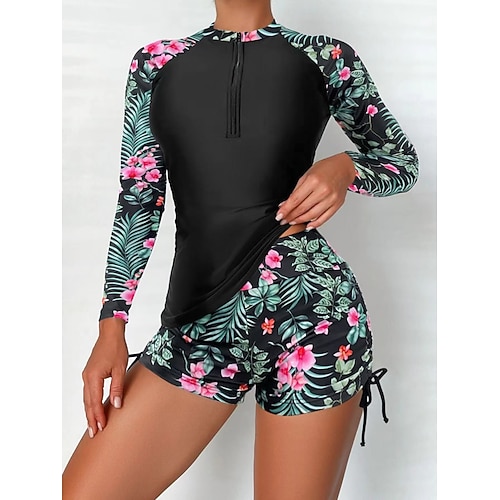 Per donna Costumi da bagno Tankini Due pezzi Shorts Costume da bagno Controllo della Pancia Vita alta Snello Senza schiena Vacanza Abbigliamento da Spiaggia Floreale Collo Alto Manica Lunga Costumi