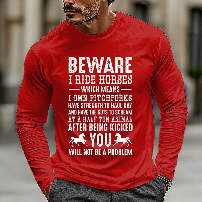 Mens Funny Horse Riding T Shirt Beware I Ride Horses I Own Pitchforks Quote Long Sleeve Graphic Tees Novelty Rancher Cowboy Gift For Him Clothing Apparel S M L XL XXL XXXL