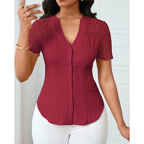 Per donna Camicia Blusa Semplice Elegante Moderno Casual Manica Corta Scollo a V Top Regolari Quotidiano Ferie Uscire Pizzo Bottoni Blu Nero Bianco Giallo Vino Estate Primavera