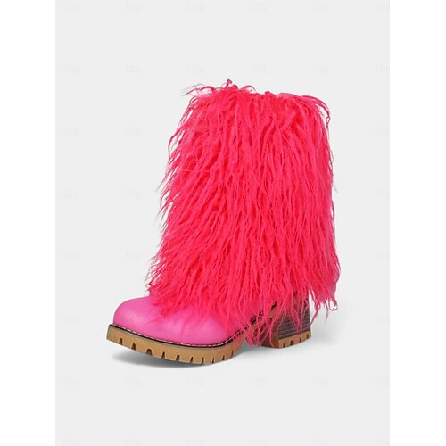 Damen Mardi Gras Rosarote Kunstpelz-Stiefel bis zur Wadenmitte - Chunky Heel Festivalstil-Boots ideal für Karnevalsumzüge Kostümpartys Straßenfeste und thematische Feiern