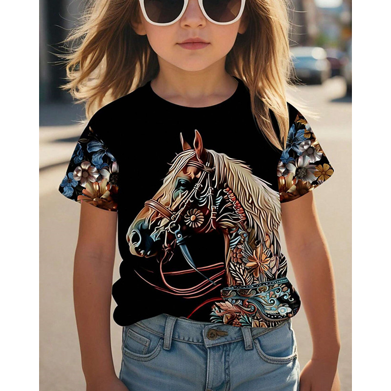 Girls' 3D Graphic Horse T shirt Tee Short Sleeve Summer Spring Fashion Basic Kids 4-12 Years Crew Neck Casual Daily Outdoor Regular Fit