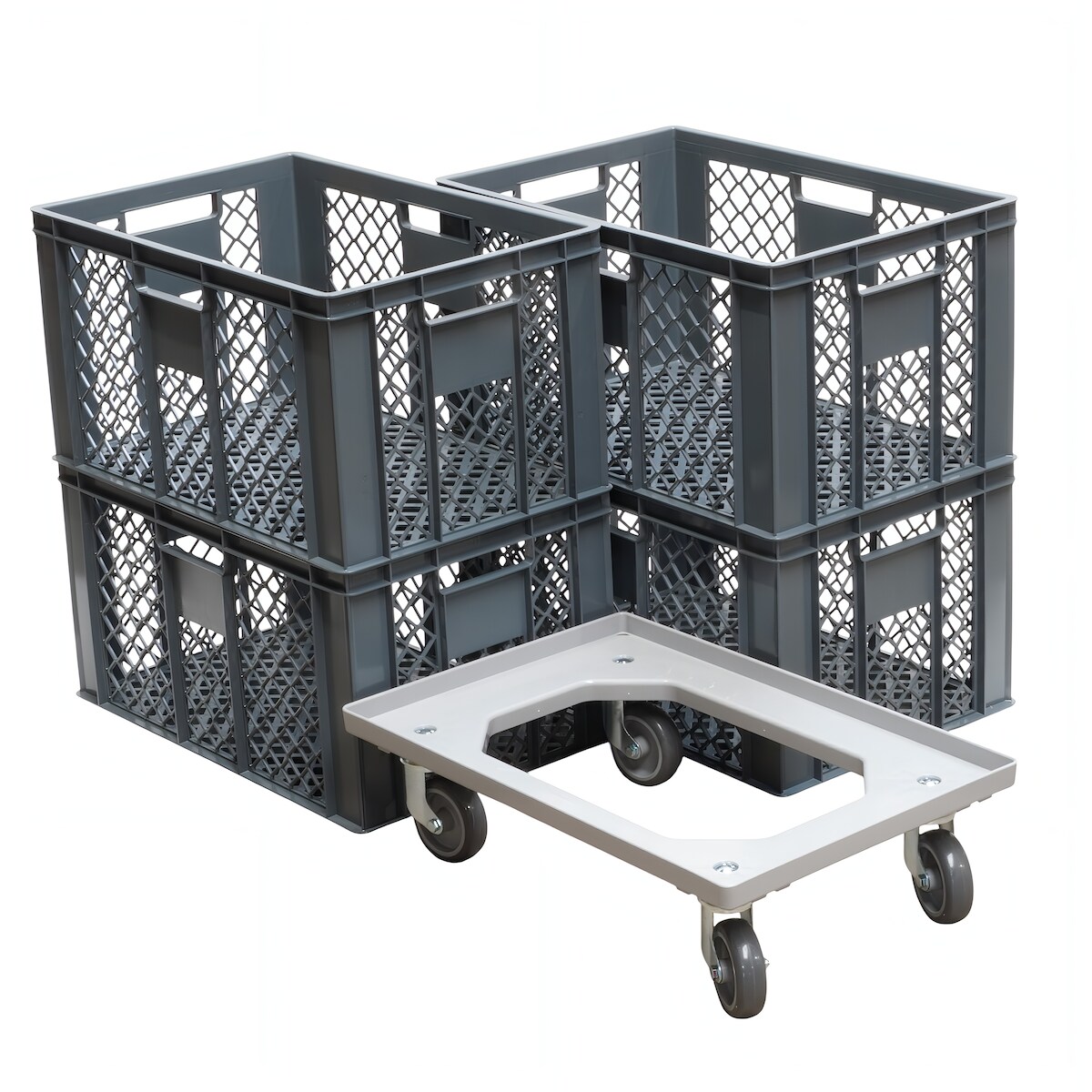 4 Stück Bäckerkisten 600 x 400 x 320 mm + 1 Transportroller in Grau