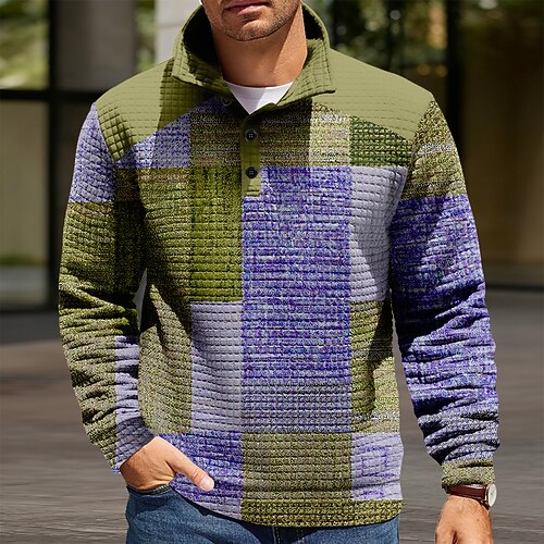 Per uomo Geometrico Plaid Nido d'ape Felpa Moda Quotidiano Classico Casual Collo alla coreana Zip a un quarto Casa All'aperto Ufficio Lavoro Blu Verde Cachi Grigio Con zip Autunno Inverno progettista