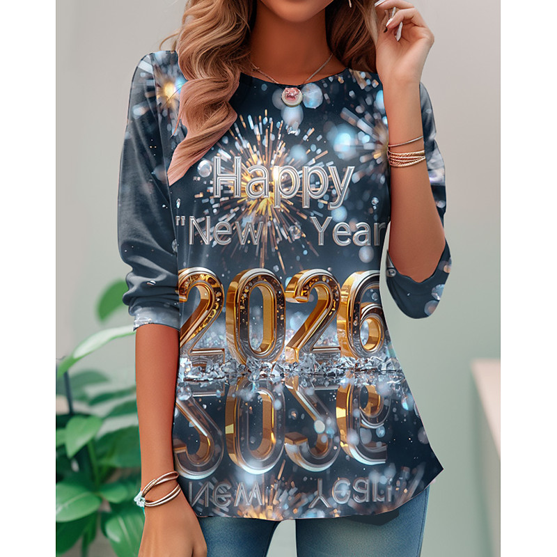 New Year Women's T Shirt Graphic Letter Vintage Stylish Casual Long Sleeve Crew Neck Regular Tops Daily Weekend Print Blue Black Red Spring Fall Winter