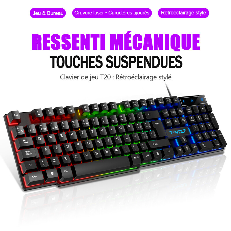 Clavier de jeu Rexsun – 104 touches, rétroéclairage arc-en-ciel, touches flottantes en silicone, design ergonomique, filaire USB, compatible Windows 7/8/10, noir, T20