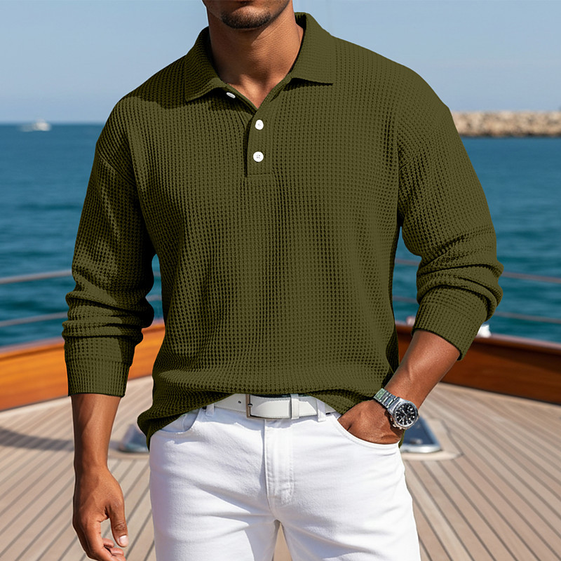 Men's Waffle Polo Shirts Textured Casual Business Ribbed Polo Collar Long Sleeve Fashion Solid Color Buttons Plain Fall Spring Fall Spring Summer Regular Fit Black Light Green Purple Green Khaki