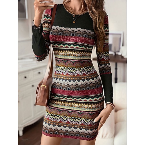 Per donna Abito al ginocchio Attillato Vestito T-Shirt Abito a Tubino Vacanza Casual Ferie Data Vestibilità aderente Grafico Geometrico Manica Lunga Girocollo Rosso Primavera Autunno Inverno