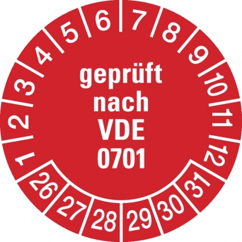 König Werbeanlagen Prüfplakette ab 26, geprüft ab 26 nach VDE 0701, rot/weiß, Ø 30 mm - Bogen = 10 Plaketten - 30 mm Folie selbstklebend