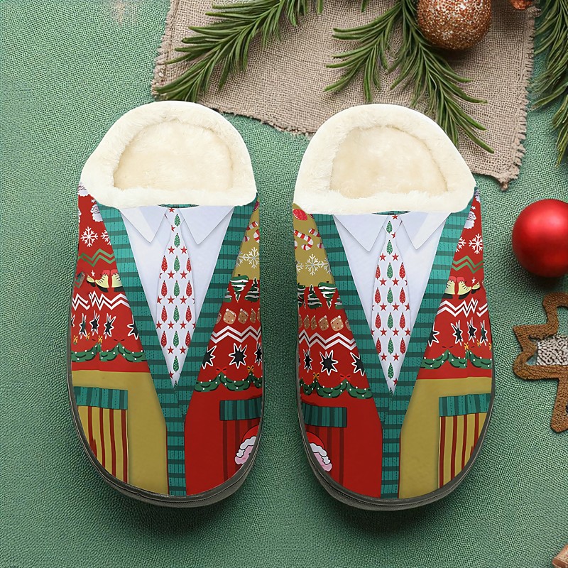 Men's Vintage Santa Claus Slippers - Warm Plush Lined Indoor Shoes with Classic Christmas Print, Cozy Winter Footwear for Home and Holiday Gifts