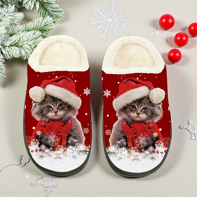 Women's Christmas Cat Slippers - Cozy Fleece Indoor Shoes with Santa Hat Kitten Print, Warm Plush Home Footwear for Winter and Holiday Gifts