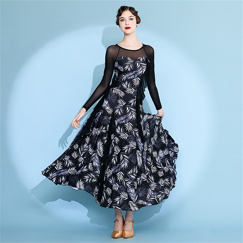 Floral Print Ballroom Dance Dress for Women - Long Sleeve A-Line Gown with Sheer Mesh Sleeves for Competitions, Latin, and Dance Events