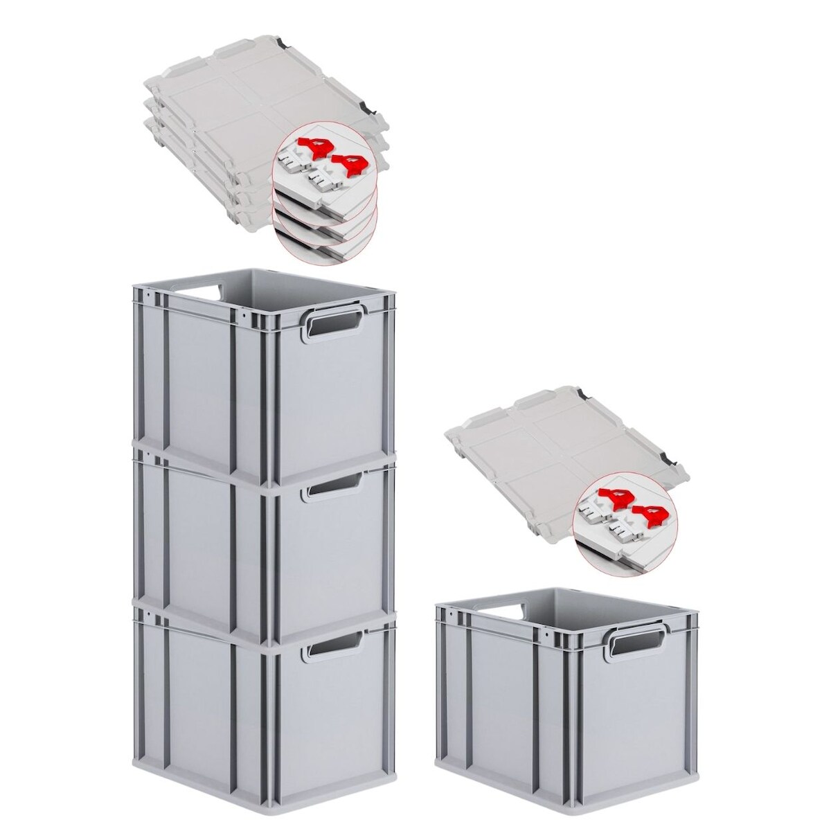 PROREGAL 4x Eurobox NextGen Grip mit Scharnierdeckel & roten Verschlüssen | HxBxT 32x30x40cm | 30 Liter | Griffe offen | Glatter Boden