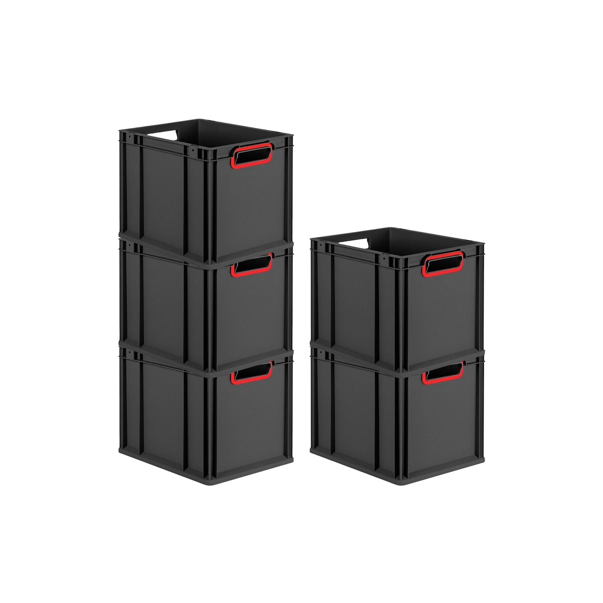 PROREGAL SparSet 5x Eurobox NextGen Color, HxBxT 32x30x40cm, 30 Liter, Griffe rot offen, Schwarz, Eurobehälter, Transportbehälter