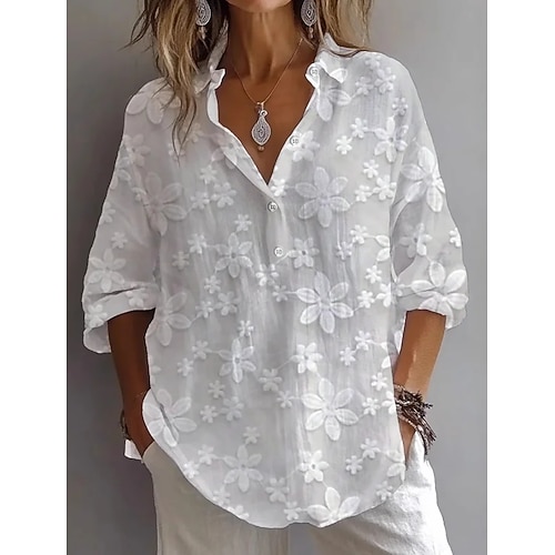 Per donna Blusa Semplice Casual Manica 3/4 Scollo a V Top Regolari Ricamato Bottoni Nero Bianco Primavera Autunno
