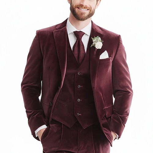 Uomo matrimonio invernale Feste Abito di velluto Bavero classico Nero Borgogna Festa Formale Tinta unita Vestibilità su misura 3 pezzi Monopetto Due Bottoni