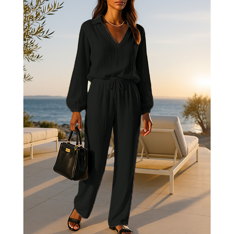 Women's Fashion Streetwear Shirt Linen-Inspired Sets Two Piece Sets Linen Pants Baggy Shorts Long Sleeve Shirt Collar Solid Color Daily Wear Date Black Khaki Spring Regular Fit