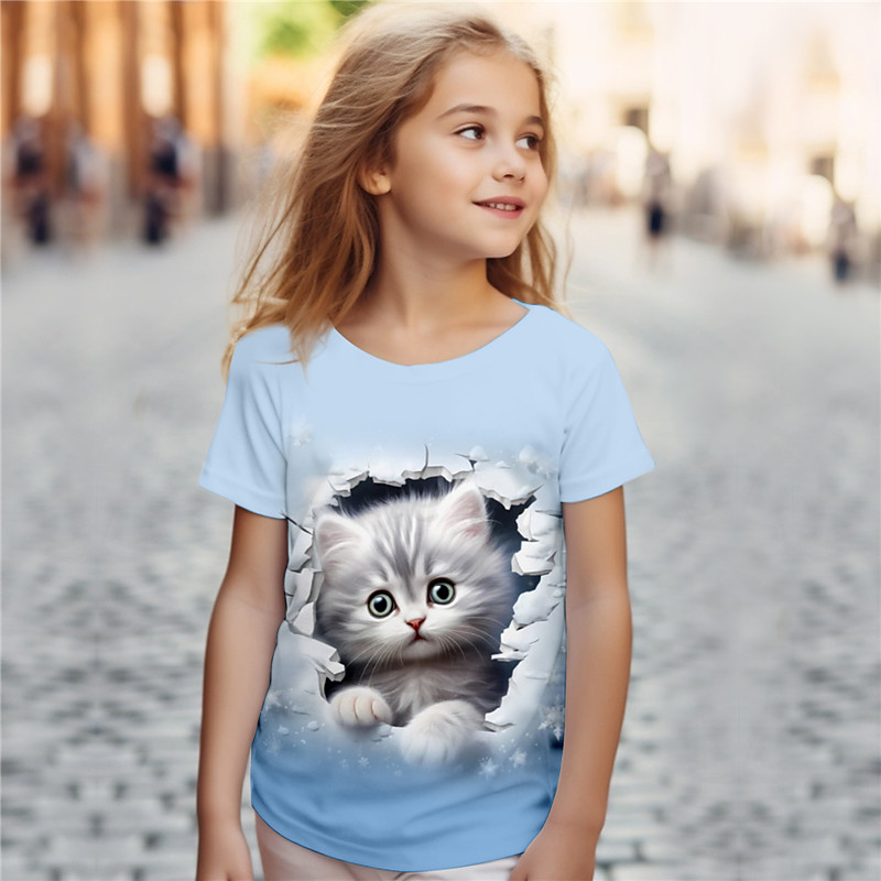 Girls' 3D Cat Tee Shirts Short Sleeve 3D Print Summer Active Fashion Cute Polyester Kids 3-12 Years Crew Neck Outdoor Casual Daily Regular Fit