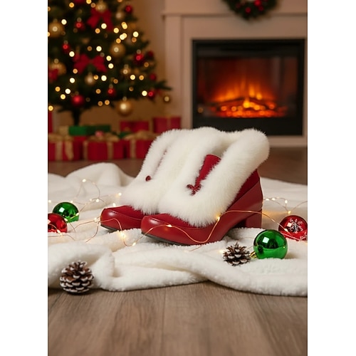 stivaletti da donna in similpelle rossa con polsino in pelliccia sintetica e cerniera, punta affilata, elegante tacco a spillo, perfetti per Natale, feste e occasioni festive