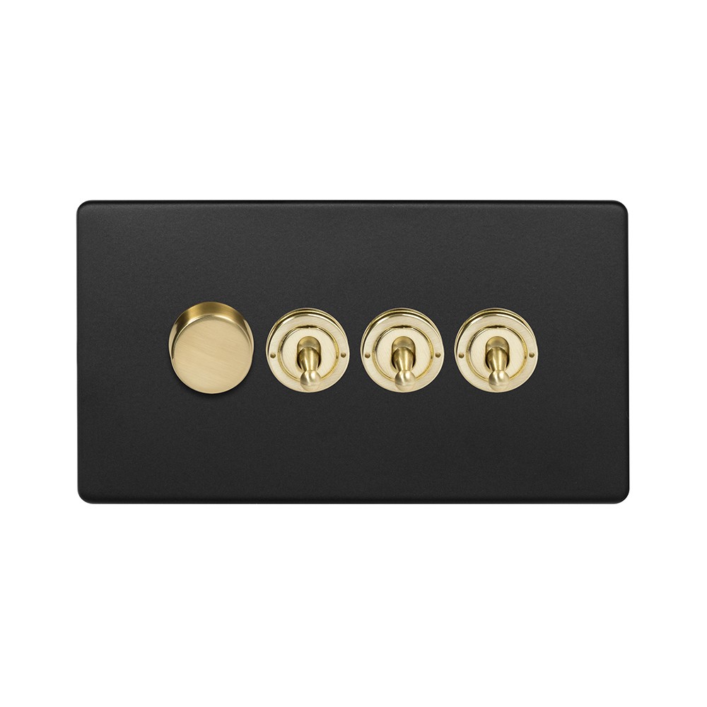 Soho Lighting Matt Black & Brushed Brass 4 Gang Switch with 1 Dimmer (1x150W LED Dimmer 3x20A 2 Way Toggle)