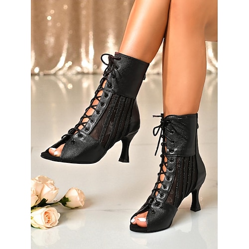 stivaletti neri con lacci e punta aperta da donna, scarpe da ballo con tacco alto in rete per serate di gala, ballo di fine anno abiti da festa