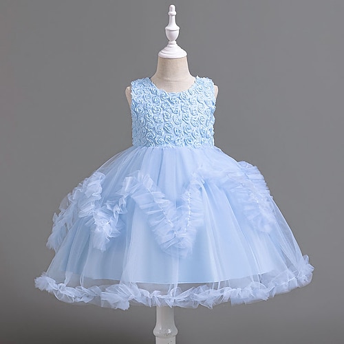 Abito da damigella d'onore bambina Ragazze Abito formale Abiti da sposa Feste Matrimonio Formale Moda Principessa Dolce Abito per la Prima Comunione Rete Tinta unica Senza Maniche Girocollo Blu Bianco