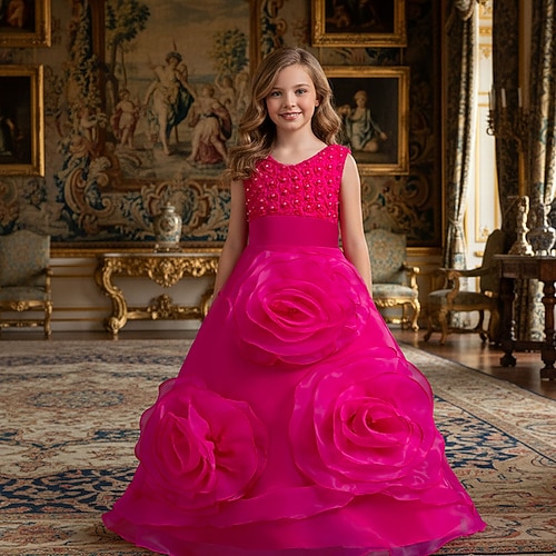 Abito da damigella d'onore bambina Ragazze Abito formale Abiti da sposa Feste Matrimonio Formale Moda Principessa Bello Rete Floreale Senza Maniche Girocollo Blu Rosa Dai 4 anni in su