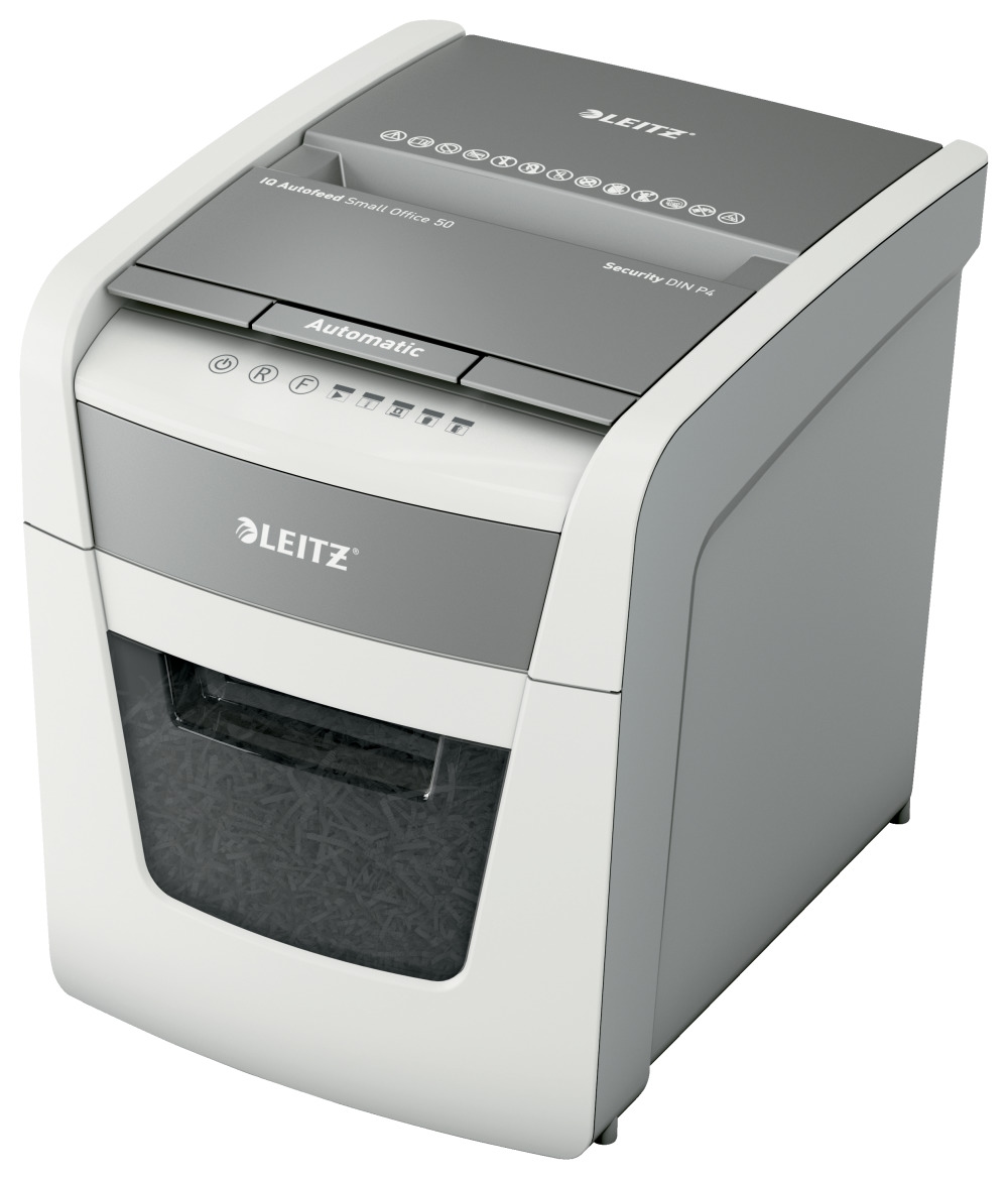 Leitz IQ Autofeed Small Office Partikelschnitt Aktenvernichter P4, Automatisch, 50 Blatt, 20 Liter Abfallbehälter, Weiß, 80350000