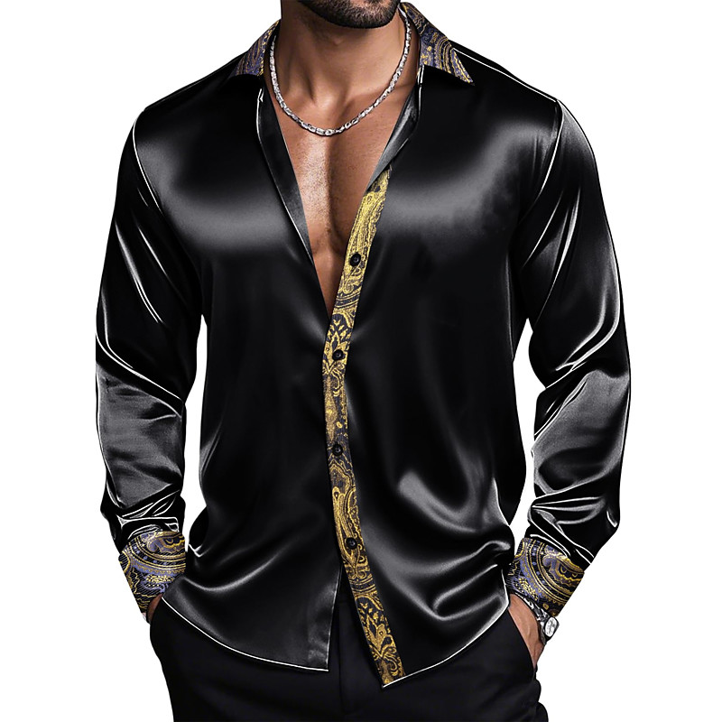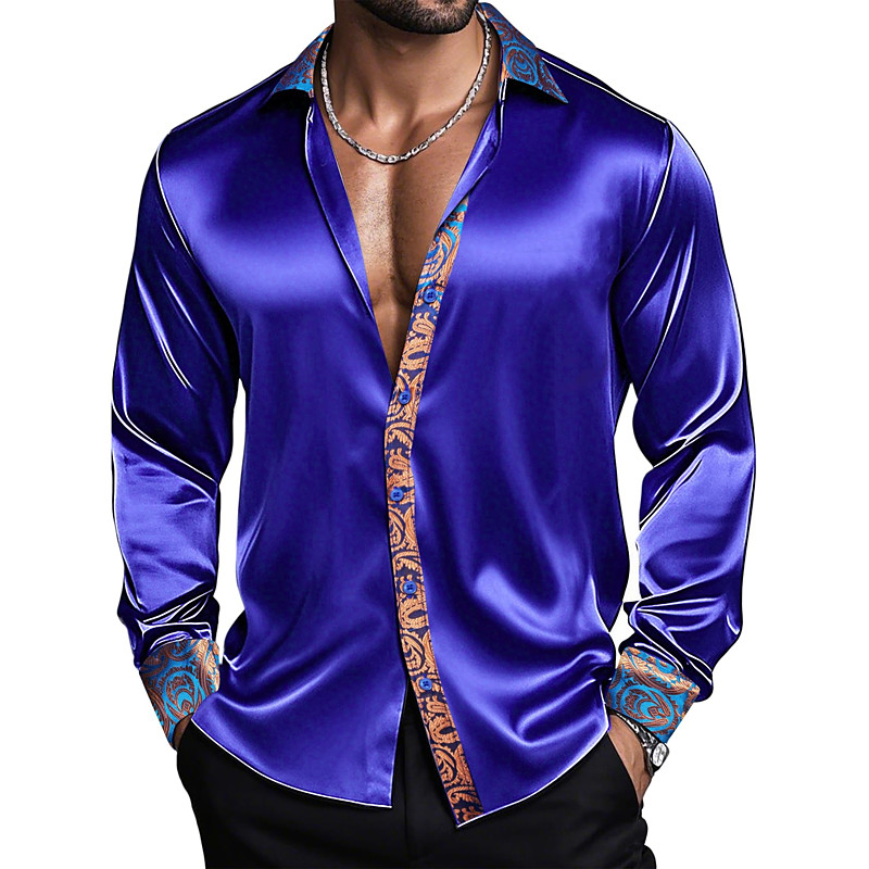 Men's Shirt Satin Shirt Dress Shirt Casual Shirt Button Up Shirt Prom Shirt Plain Formal Wedding Black Royal Blue Gold Long Sleeve Lapel Spring Fall All Seasons Clothing Apparel Patchwork
