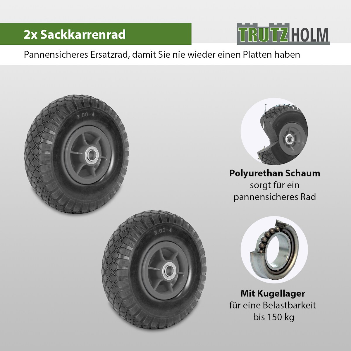 Baumarktplus 2x Sackkarrenrad PU-Rad 260x85 mm 3.00-4 75 mm zentrierte Nabe Ø 20 mm grau Vollgummi Bollerwagen
