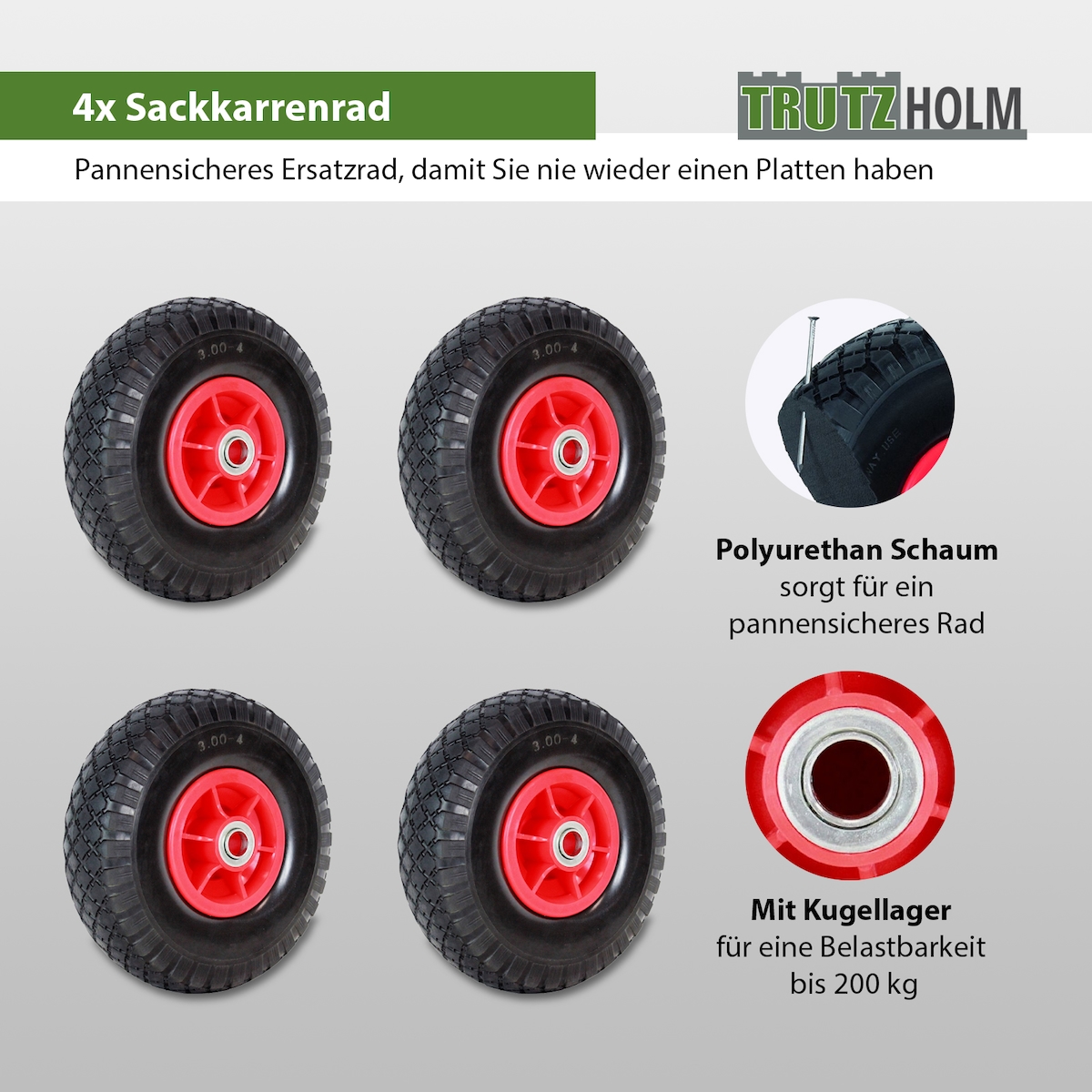 TRUTZHOLM 4x Sackkarrenrad PU-Rad 260x85 mm 3.00-4 60 mm versetze Nabe Ø 20 mm rot Vollgummi Bollerwagen