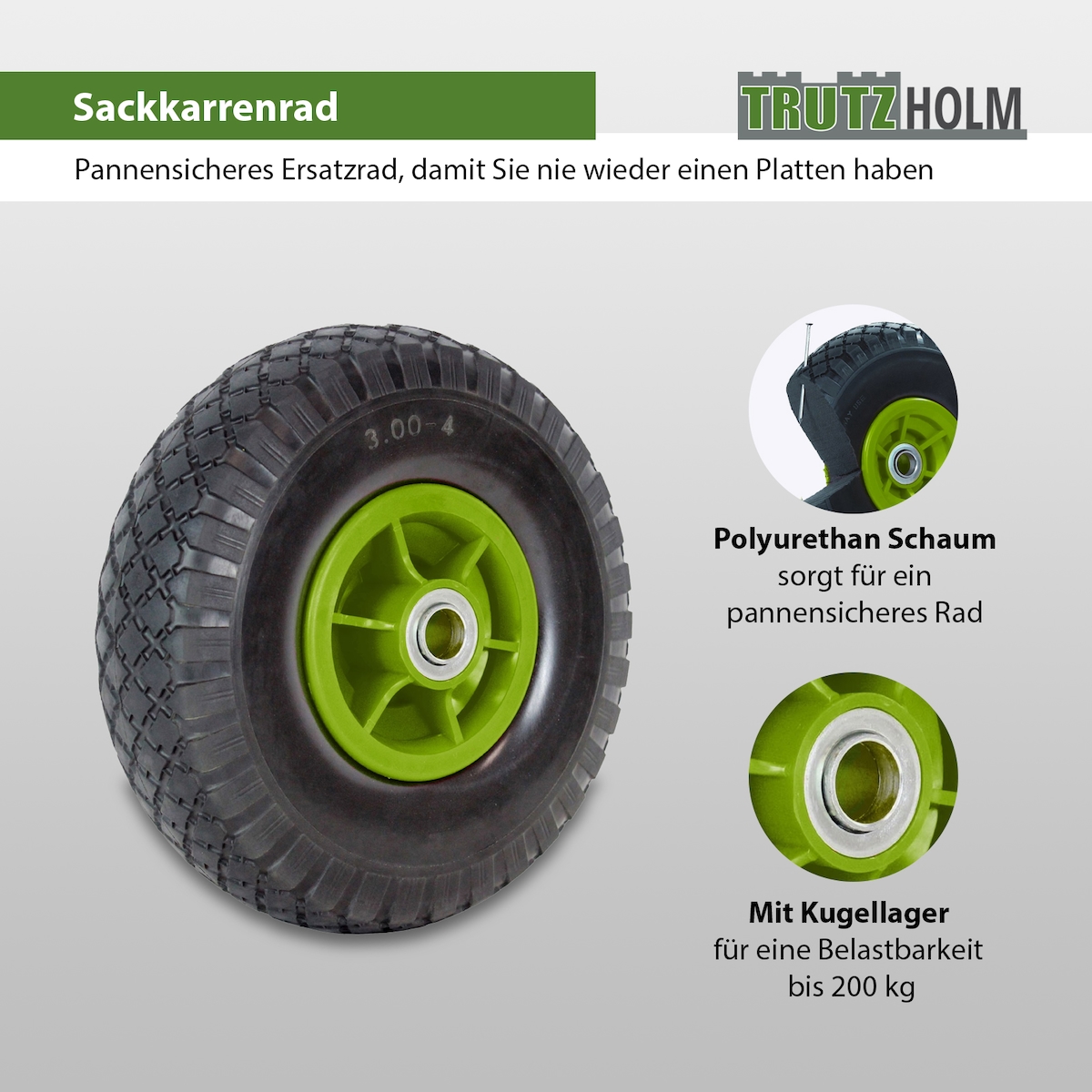 Baumarktplus Sackkarrenrad PU-Rad 260x85 mm 3.00-4 60 mm versetzte Nabe Ø 20 mm grün Vollgummi Bollerwagen
