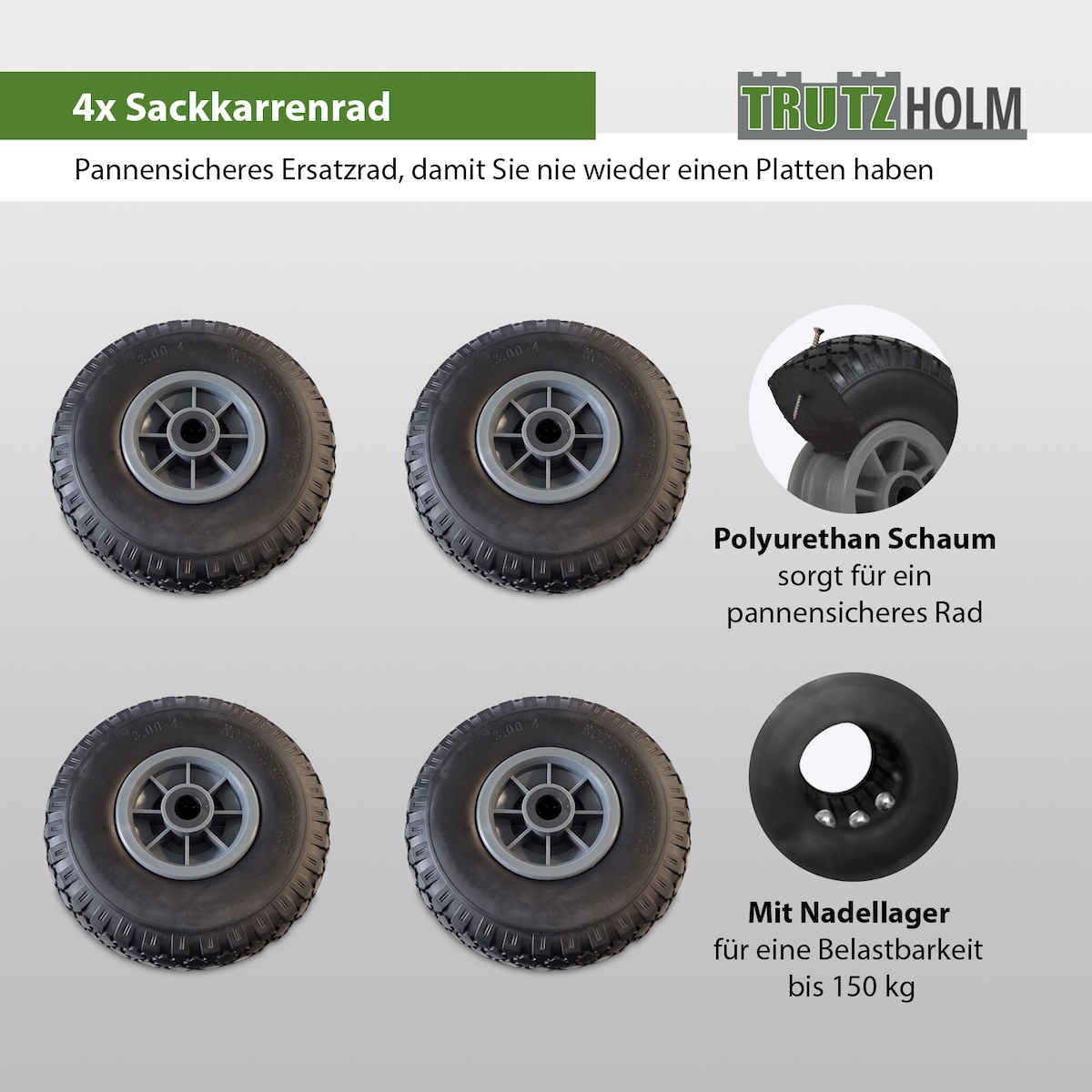 Baumarktplus 4x Sackkarrenrad PU-Rad 260x85 mm 3.00-4 75 mm zentrierte Nabe Ø 20 mm grau Vollgummi Bollerwagen